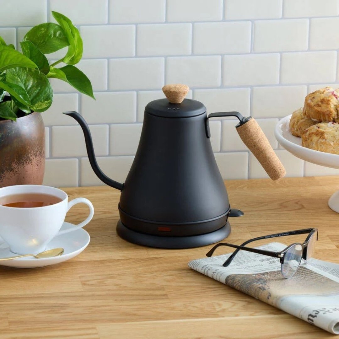 Jewelshrine Gooseneck Electric Kettle with Cork Handle and Matte Black Finish Design